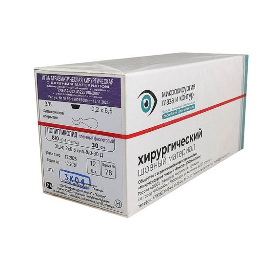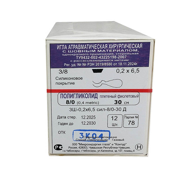 - Минимальная травматичность: Ультратонкая нить размера 8-0 (диаметр ~0,04 мм) и атравматичная шпательная игла сводят к минимуму повреждение нежной роговичной ткани.